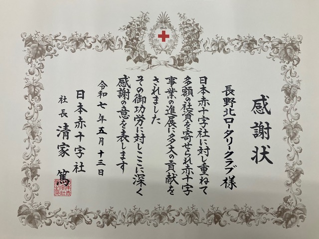 皆さんこんにちは。先週の木曜日、長野県赤十字社有功会総会が南県町の日本赤十字社長野県支部で開催されました。以前、赤十字の血液センターがあったところです。お昼過ぎの開会でしたが、先週は例会が休会でしたので、出席して、このような感謝状をいただいて参りました。これは昨年当クラブ創立40周年事業の一環として、長野赤十字病院に寄付をしたことへの感謝状です。会では赤十字の活動報告や、「日赤の母」と呼ばれる、長野県佐久にゆかりを持つ「大給恒」(だいきゅうゆずる)の生涯についての講演をお聞きしてきました。元々は幕末 静岡の田野口藩主 松平乗謨(のりたか)であり、領地が佐久にあったことから本拠地を佐久に移し、五稜郭を竣工した人物です。明治維新を迎え 大給恒と改名し、陸軍総裁など歴任し、勲章局総裁を務めたそうです。「日赤の父」と言われる佐野常民(つねたみ)とともに博愛社の設立を模索しましたが、戦争で怪我を負った敵陣の兵も救護するという社則がネックとなり、なかなか受け入れられなかったそうです。その後ジュネーブ条約、赤十字条約と言われる条約「戦地軍隊における傷病者の状態改善に関する条約」に日本も加盟し、日本赤十字社と改称し、以降15年に渡り副社長を務めたところから「日赤の母」と言われています。翌年には、明治以降日本で犠牲者の最も多い火山災害と言われる磐梯山噴火の救援活動を行いましたが、戦争ではなく平時の救護活動を行なった赤十字世界初の救護活動となりました。今では当たり前のことですが、当時としては画期的な活動であったのでしょう。ロータリーの精神にもつながるお話しでした。さて、17日・18日伊勢中央RC創立35周年式典にご参加された皆様、お疲れ様でした。出発した土曜日の朝は雨模様で、しなの号で名古屋に向かい、名古屋から近鉄特急「しまがぜ」で伊勢市に着き、外宮を参拝するときまで降っていましたが、1時間後に原さんが外宮にお着きになってお会いした頃には雨も上がり、日曜日のゴルフコンペ、エクスカーションも、お昼頃には暑くて汗をかくほどでした。伊勢30周年の式典は静粛な中でも和やかな雰囲気で挙行され、祝宴も「キッズダンス」や「和太鼓」、「伊勢音頭」は参加者皆で踊るという、伊勢ならではのおもてなしの祝宴でした。この後、堀内幹事とともに2日間を振り返り、参加された皆様からの感想等もお聞きしたいと思います。ザ マジックオブロータリー。