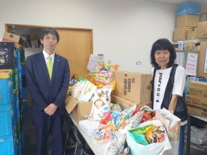 社会奉仕委員長の北村です。今日はフードドライブ皆さんのご協力、ご支援いただきましてありがとうございます。後ろのテーブルにたくさんの品物をいただきました。今年度あと2回ありますのでそちらも引き続きよろしくお願いいたします。