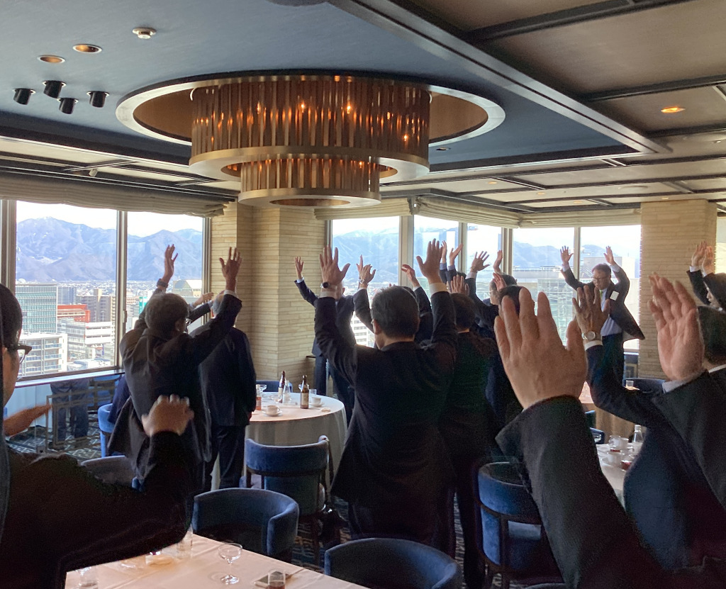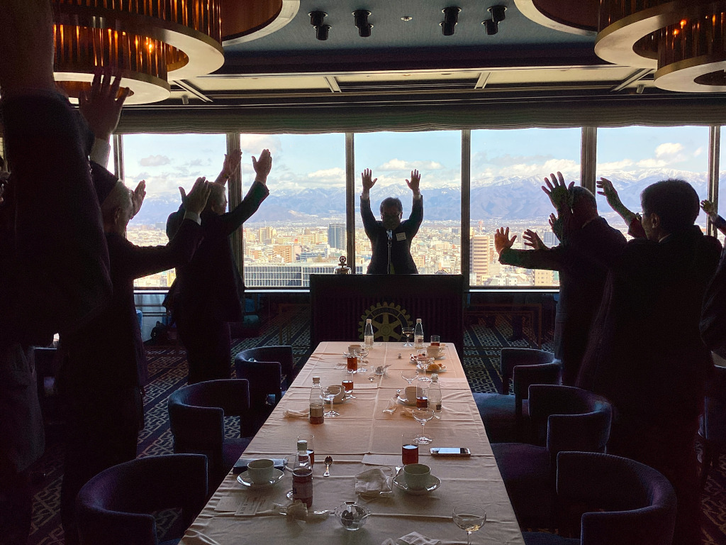 それでは、国際ロータリー第2600地区、そして北信第二グループ、そして本日ご臨席いただきました長野東クラブ、長野北東クラブ、原名誉会員、李君をはじめお世話になった皆様のこれからの明るい未来を願って万歳三唱。万歳、万歳、万歳。